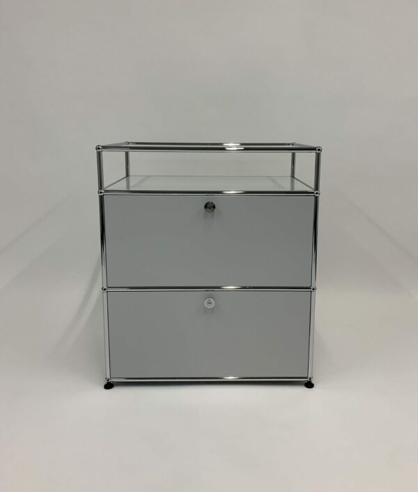 Selbst nach Jahren der Nutzung als Büro- oder Wohnmöbel bieten die flexiblen Sideboards, Highboards und Regale eine erstaunliche Vielseitigkeit. Sie können mühelos umgebaut werden, um verschiedenen Bedürfnissen gerecht zu werden. Dank der hochwertigen Qualität der schweizerischen Designmöbel ist auch das Hinzufügen oder Erweitern von Funktionen wie Klappen problemlos möglich. Die glatten Metallfronten der Sideboards eignen sich ideal für kleinere Räume und verhindern ein überfülltes Erscheinungsbild. Stattdessen schaffen sie eine größere Raumwirkung. Bei 4Classics können Sie Ihr eigenes individuelles USM Haller Sideboard gestalten und die passende Größe, Tiefe und Höhe auswählen. Mit einer breiten Auswahl an Optionen, wie Schubladen und Fächern, finden alle Ihre Utensilien ihren Platz.